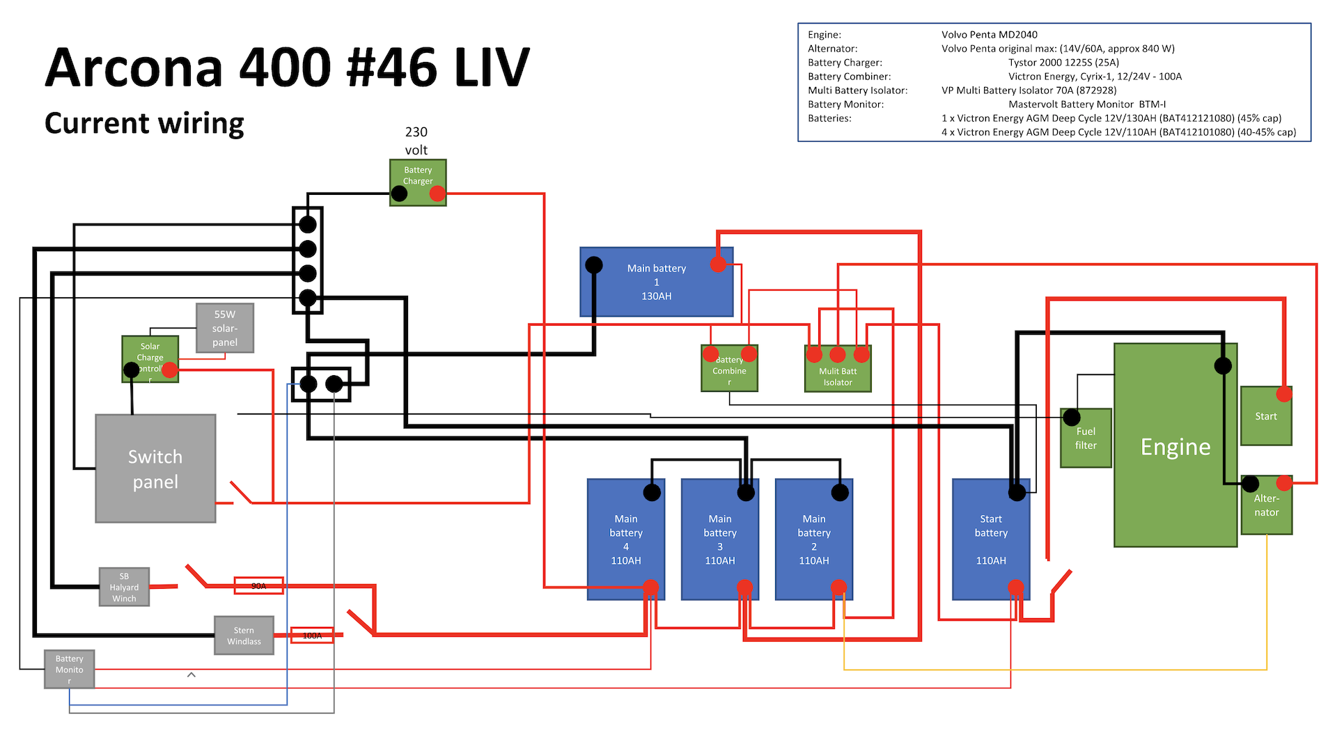 The existing wiring was not standard wiring from Arcona. Instead it was added on and changed by the first owner when more batteries etc was added. We are the third owner as far as I know. No complaints about the second owner that we bought Liv from, he either knew what he was doing when performing upgrades or used professionals.