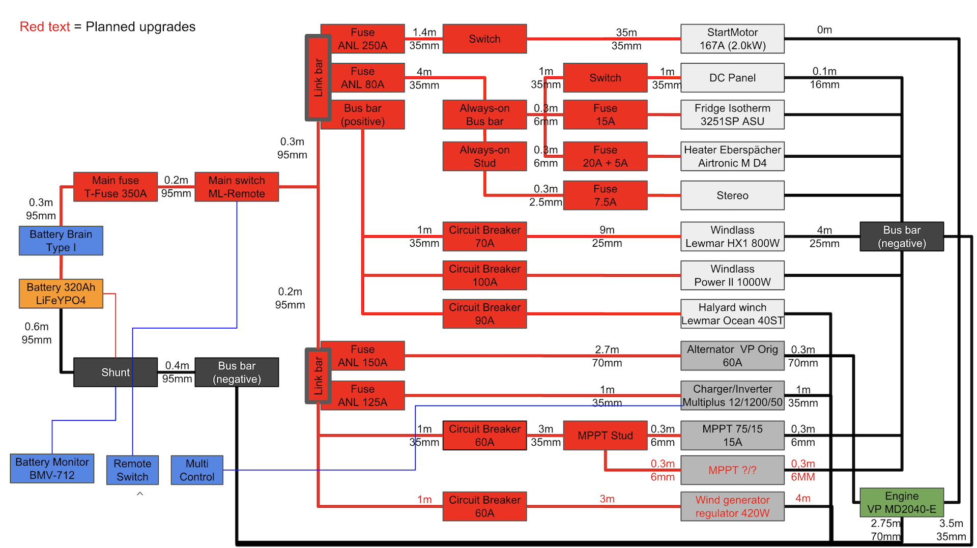 The old cables running from the batteries to the DC panel and always on was 10mm2. Even if I added the 25mm2 negative cable from bow windlass to the negative bus bar I was not worried. The new positiv and negative cables from the batteries to the DC panel area are now both 35mm2.