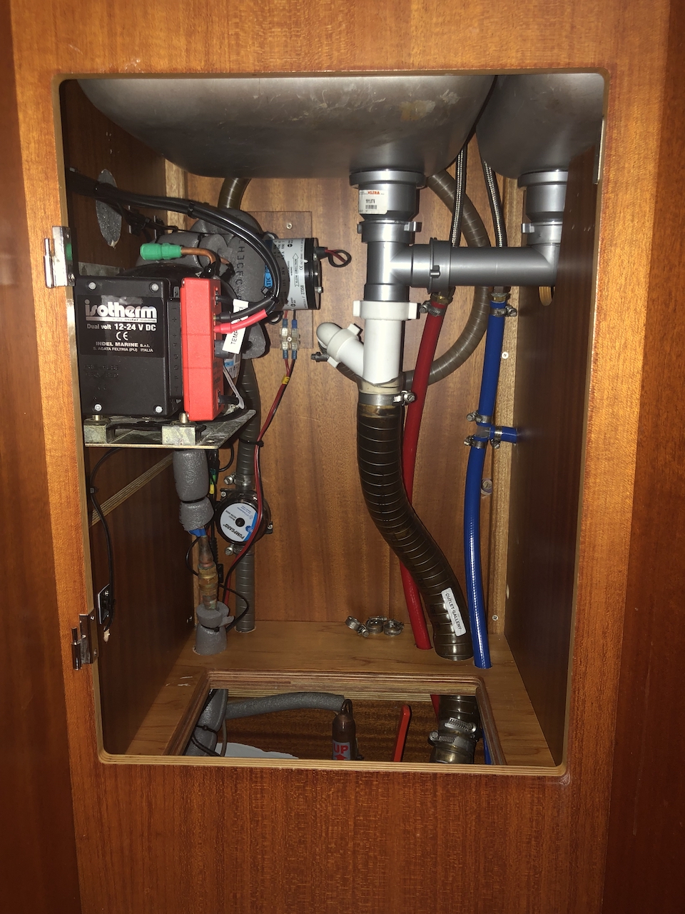 The second best option was to mount the compressor underneath the sink. This used to be where we kept our old waste bin. The installation of the compressor is not perfect. The wires from the compressor are a bit exposed. But this was the only option without having to extend the pipes.