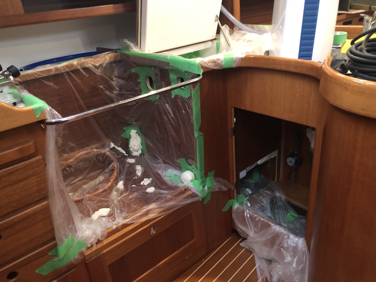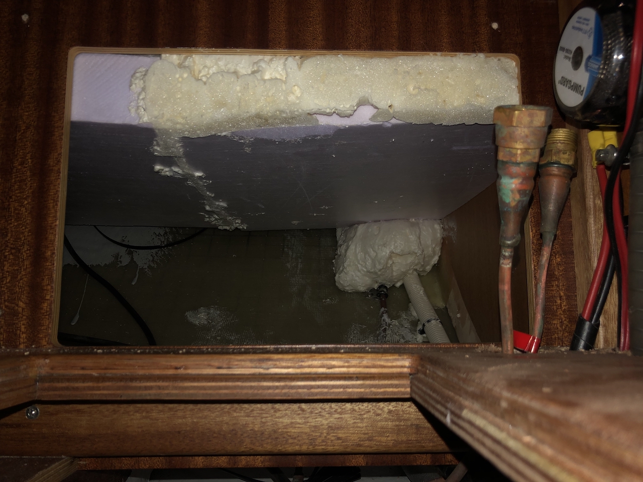 Instead, I accidentally foamed a section of where the hoe for filling the water tank would run. Johan had to spend a little bit of time cutting parts of the foam to fit the hoe for filling the tank. Fortunately, this was only a small section of where the hoe would run, so it was easily fixed.
