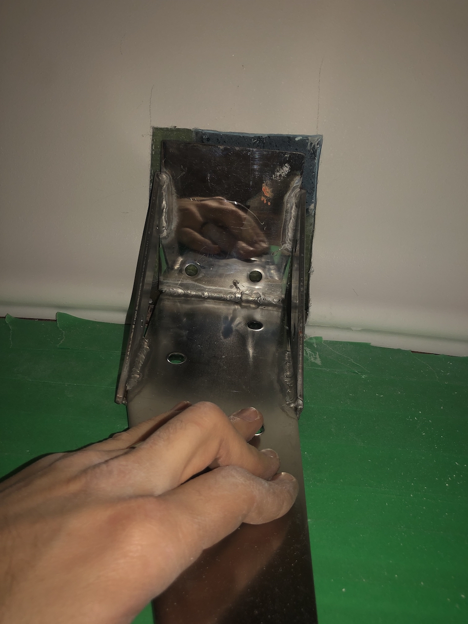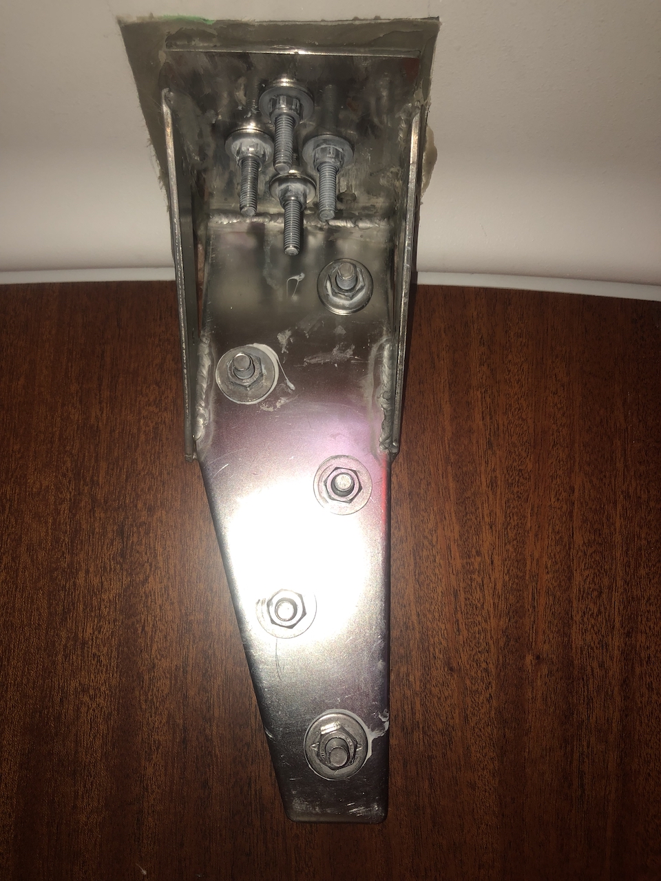 The stainless steel fitting is first glued to the deck using fiberglass putty, with the putty reaching up to the top layer of fiberglass of the deck at the bolts. I then bolted the fitting to the bulkhead and drilled new holes from the top through the fiberglass putty and the stainless steel fitting.