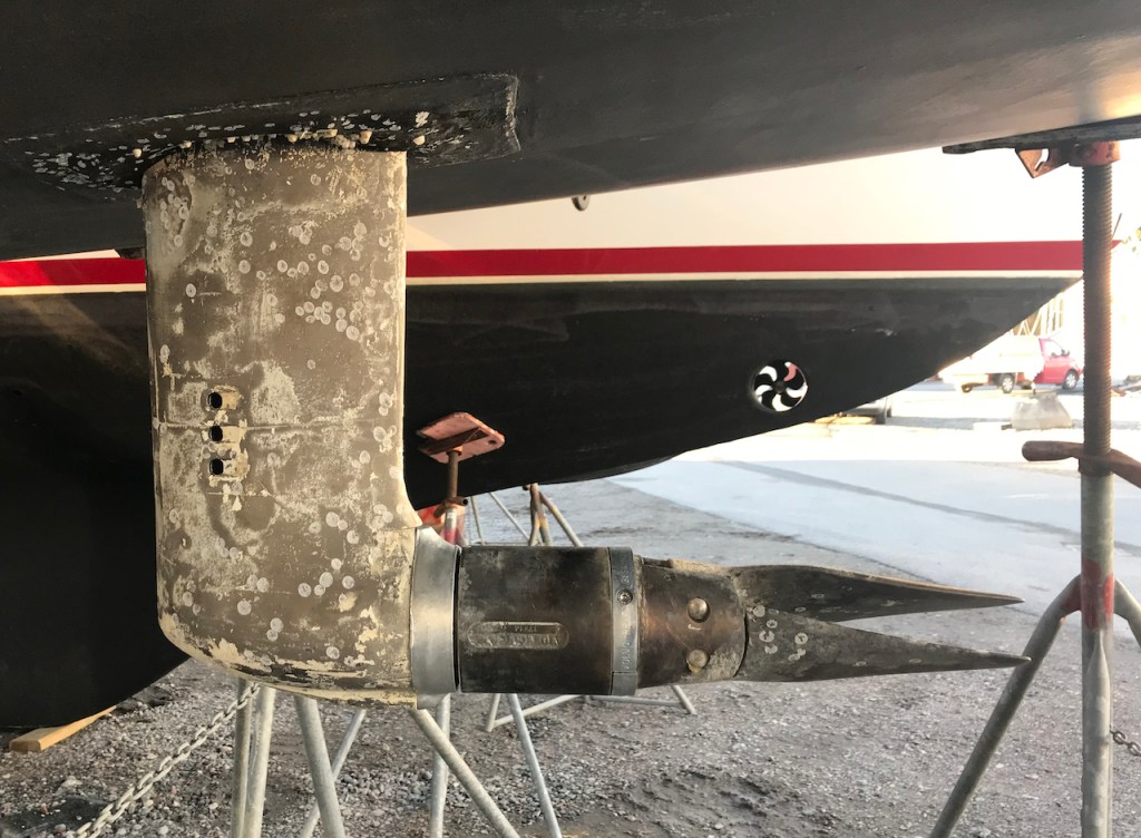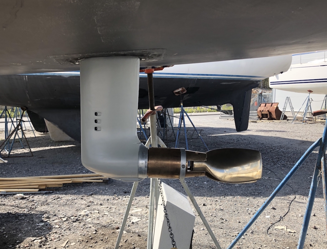When planning to sand the hull to racefinish, I could not leave the saildrive and propeller the way it was. The brass on the propeller needed polishing, and the saildrive required both sanding and additional coats of epoxy.