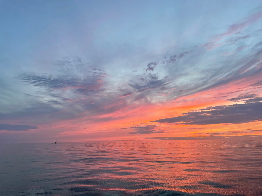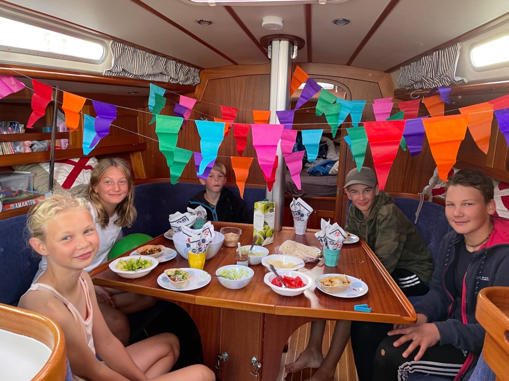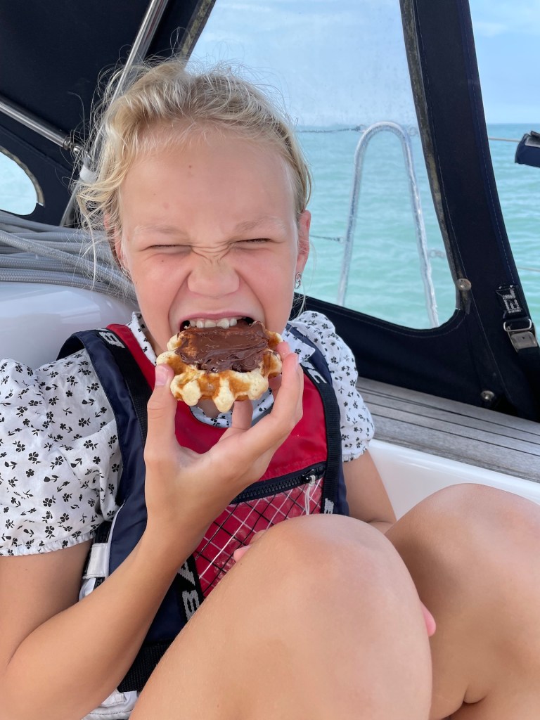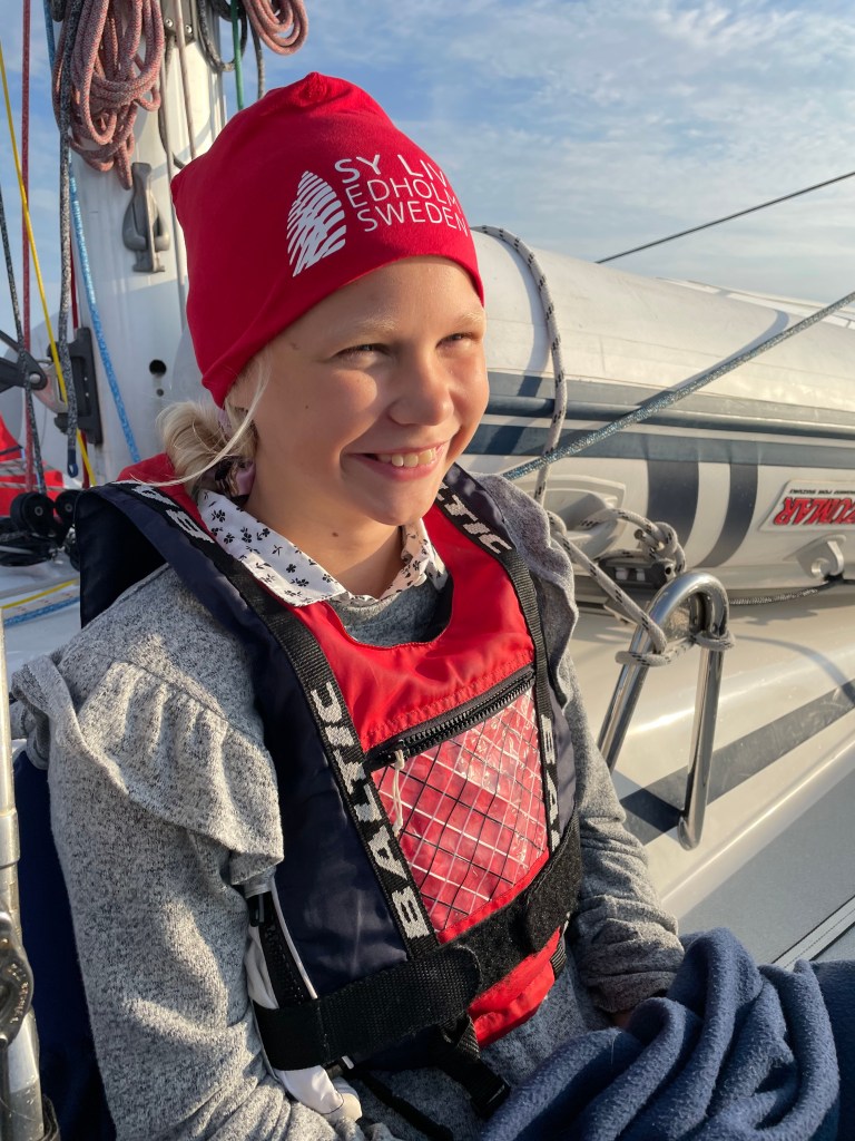 We did some longer legs of sailing this week, longer than 24h, and one of them started with a big surprise! When we (Sanna and Jonas) woke up, we received a message from Alma “Let me sleep, I have done pasta salad. If you don’t believe me – look in the refrigerator. Hope it goes well in the morning