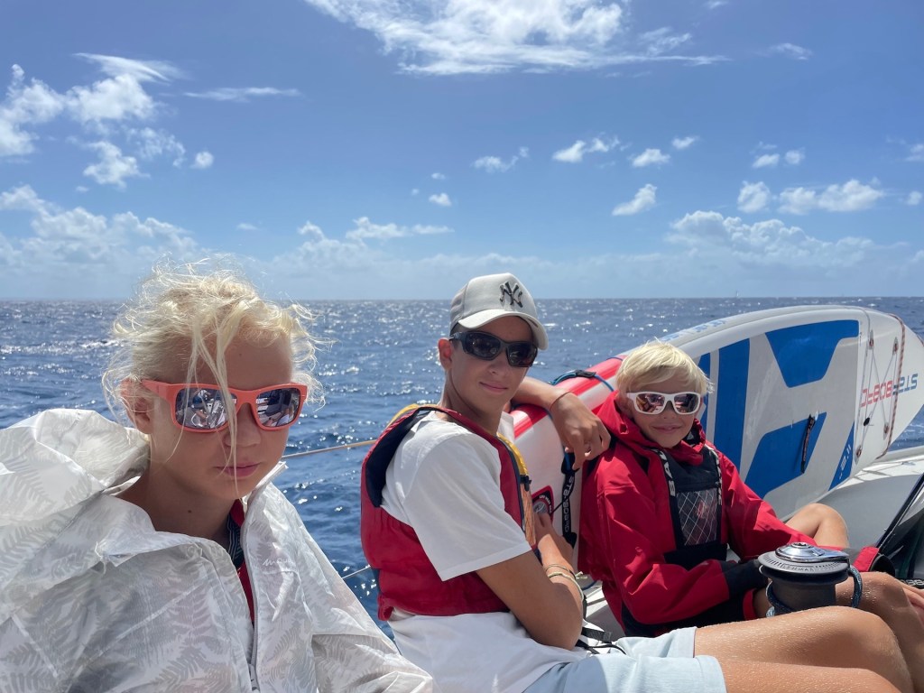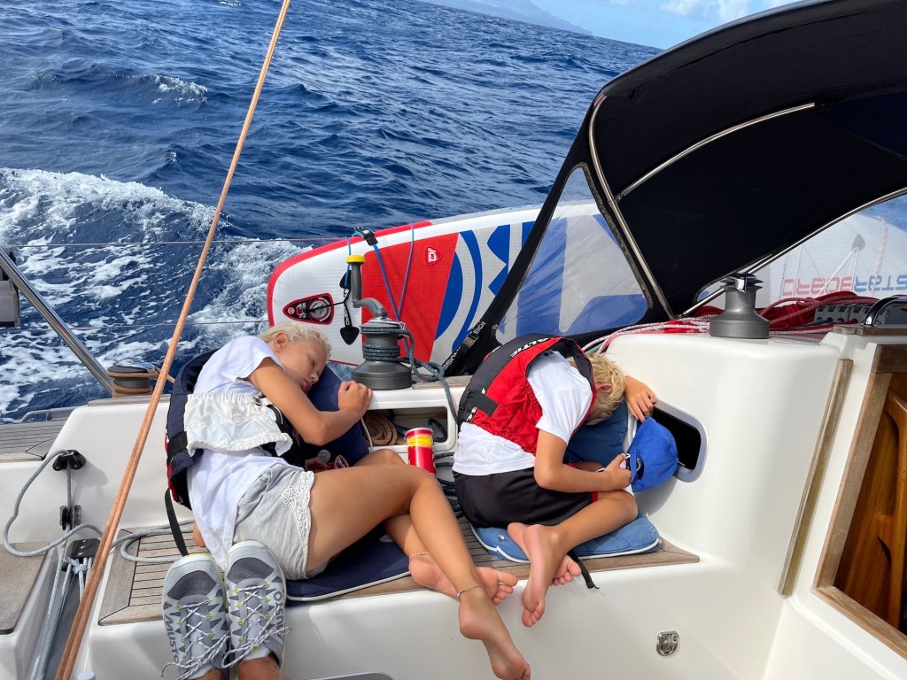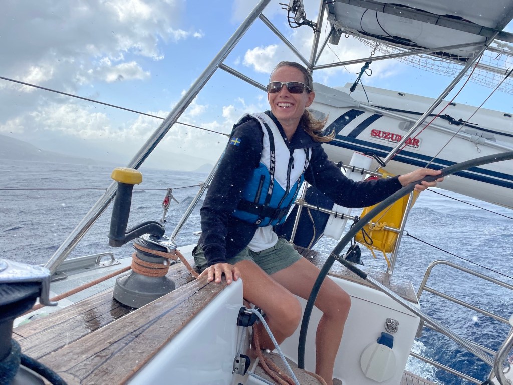 Until now Atle has been afraid when we are heeling (the fear came during the Atlantic crossing), so we have really been taking it easy. But slowly he is getting used to having the boat heeling going upwind, and is not afraid any more. Another thing that we are used to is the squalls, and the heavy rain that usually come with them. Moste often it’s Jonas who’s left alone outside in the rain, like a drenched cat, but sometimes Sanna takes the hit – or shall we say shower? ![]()