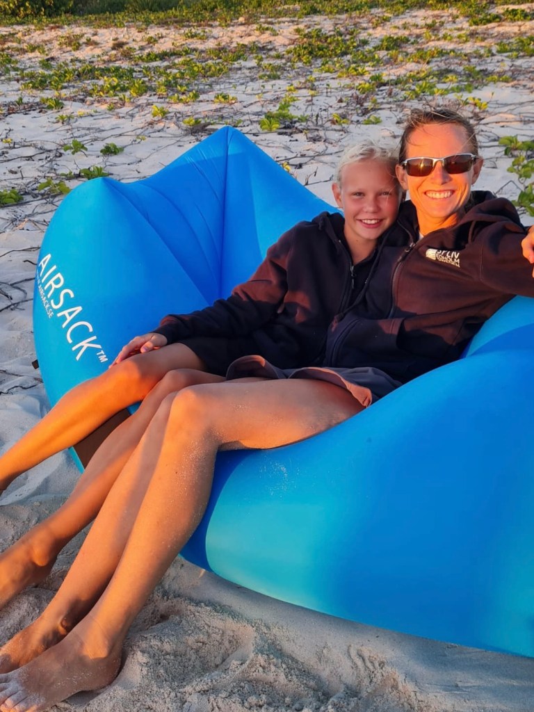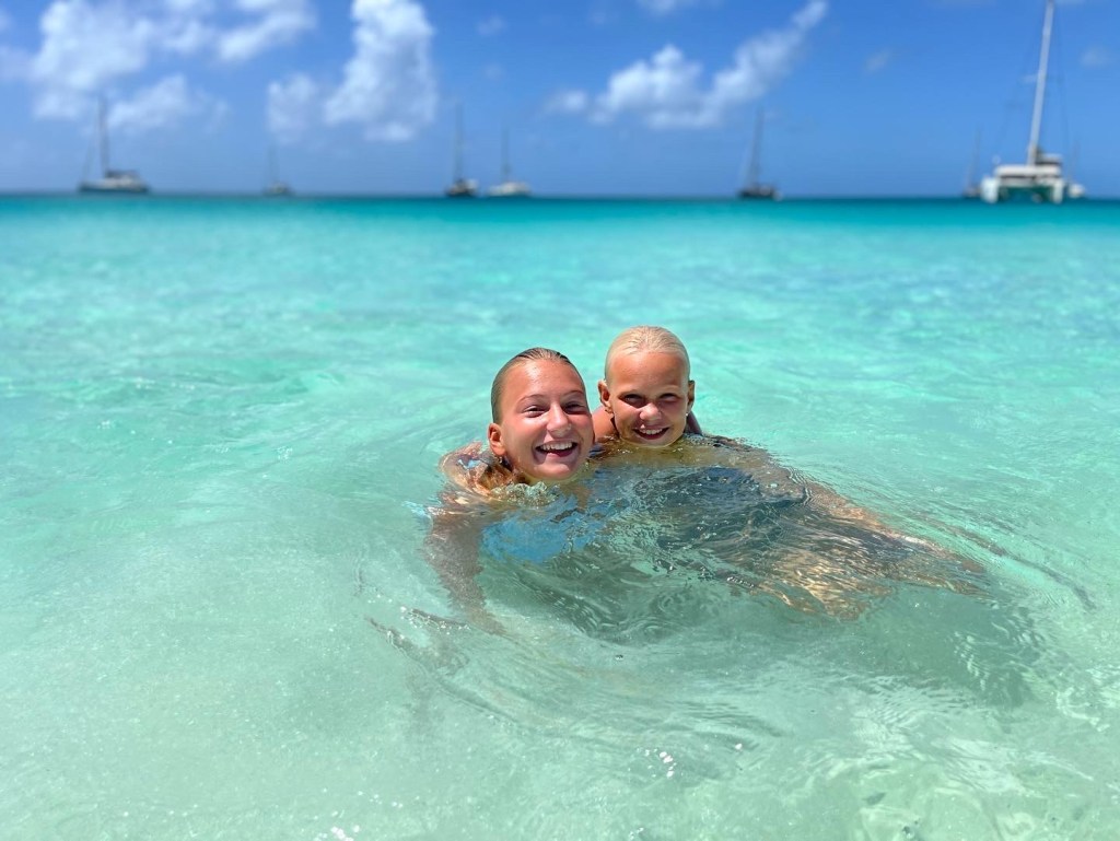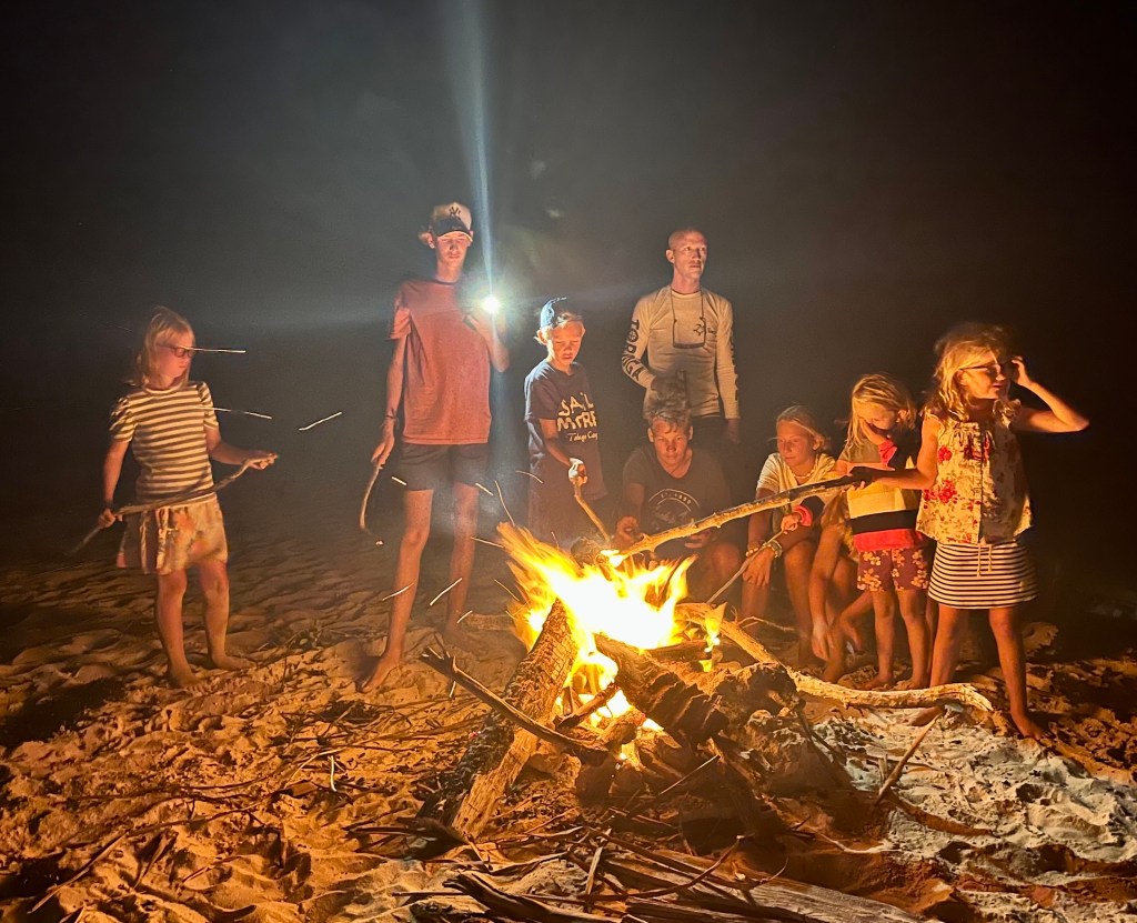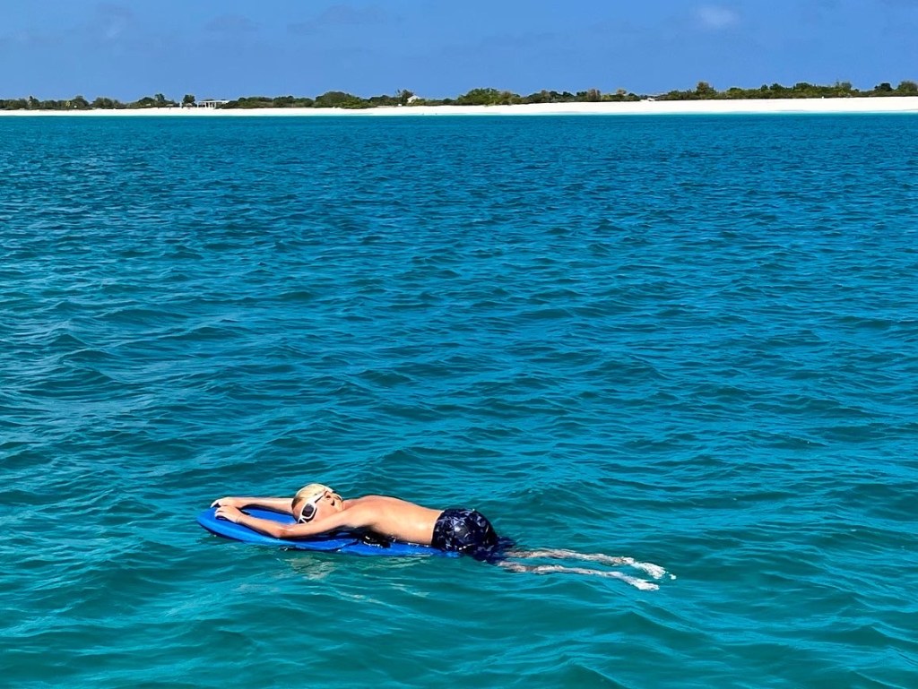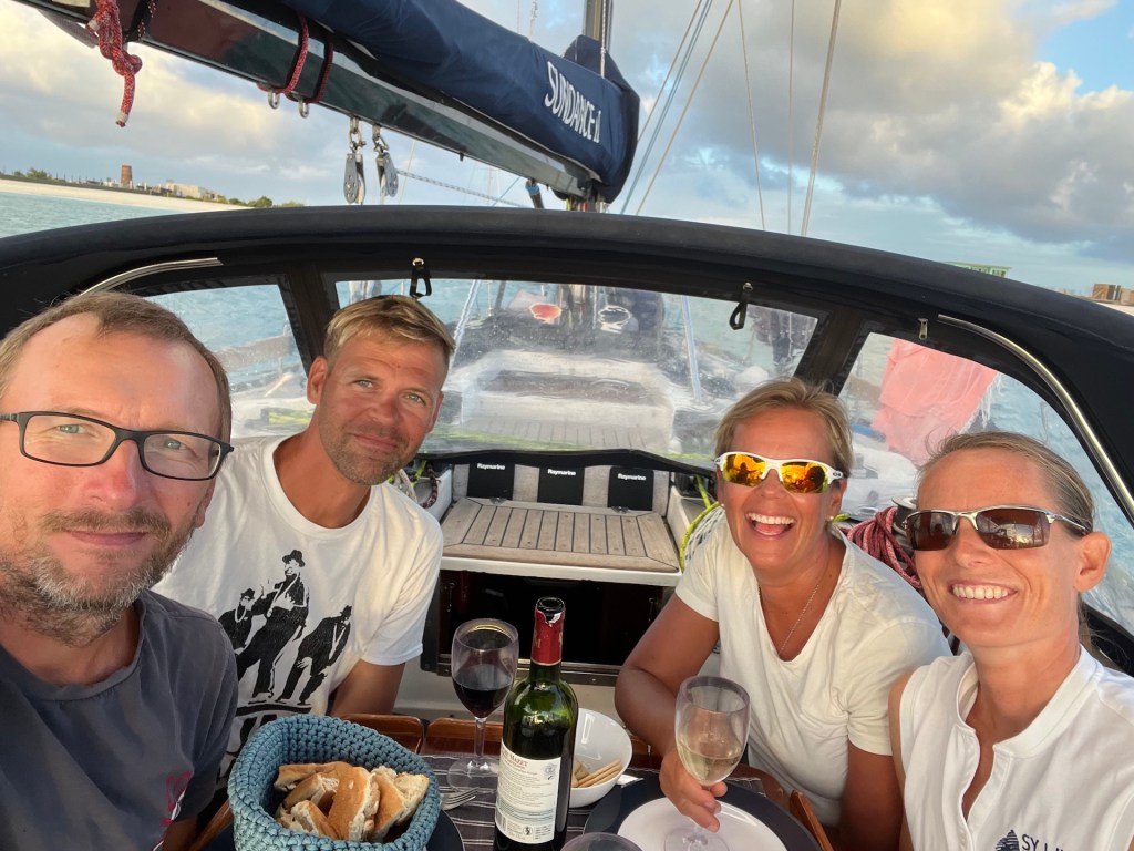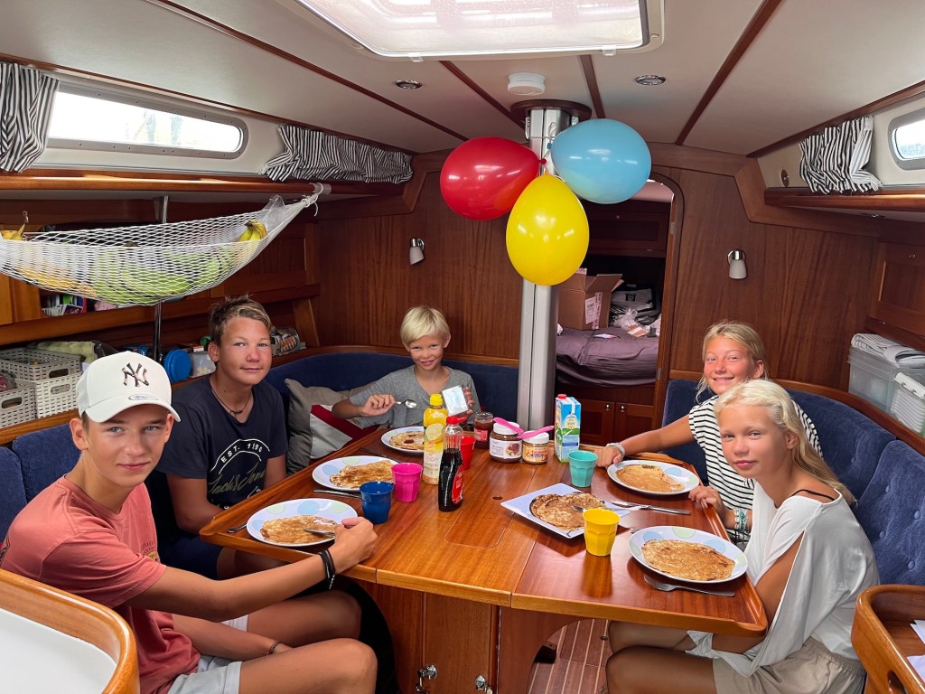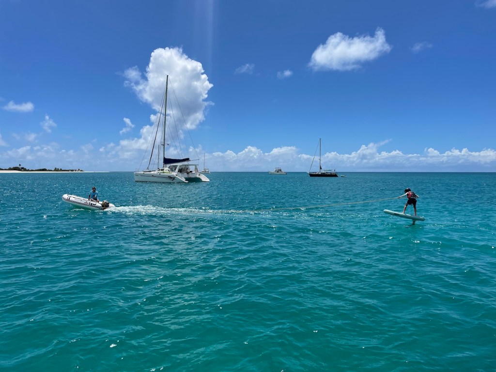 Jonas finally got a chance to start practicing with his new wing foil, this was the perfect place for it. So far it has not been much foiling, more bathing with a board and wing. But everyone enjoyed trying the board behind the dinghy – even if the flight time was short, everyone got up on the foil and had a lot fun.