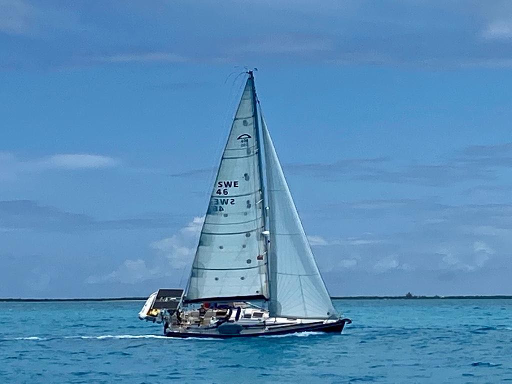 The sail back to St Martin, around 80 NM the bird path, but more when sailing upwind, started nice and smooth. But just some hours after departure we heard a “shritsh” and saw that the clew to our jib had broken and the luff on sail started to rip apart. We quickly got the jib down with, trying to save as much as possible. Hopefully it will be fixable. Ok, no jib and almost 70 nm to go upwind, what to do? We decided to, for the first time, to use our heavy weather cutter jib. It worked very well, even though it took us a few more hours to sail (luckily we have a fast boat). Good practice for us, now we also have some actual experience with our cutter jib and know that it works fine.